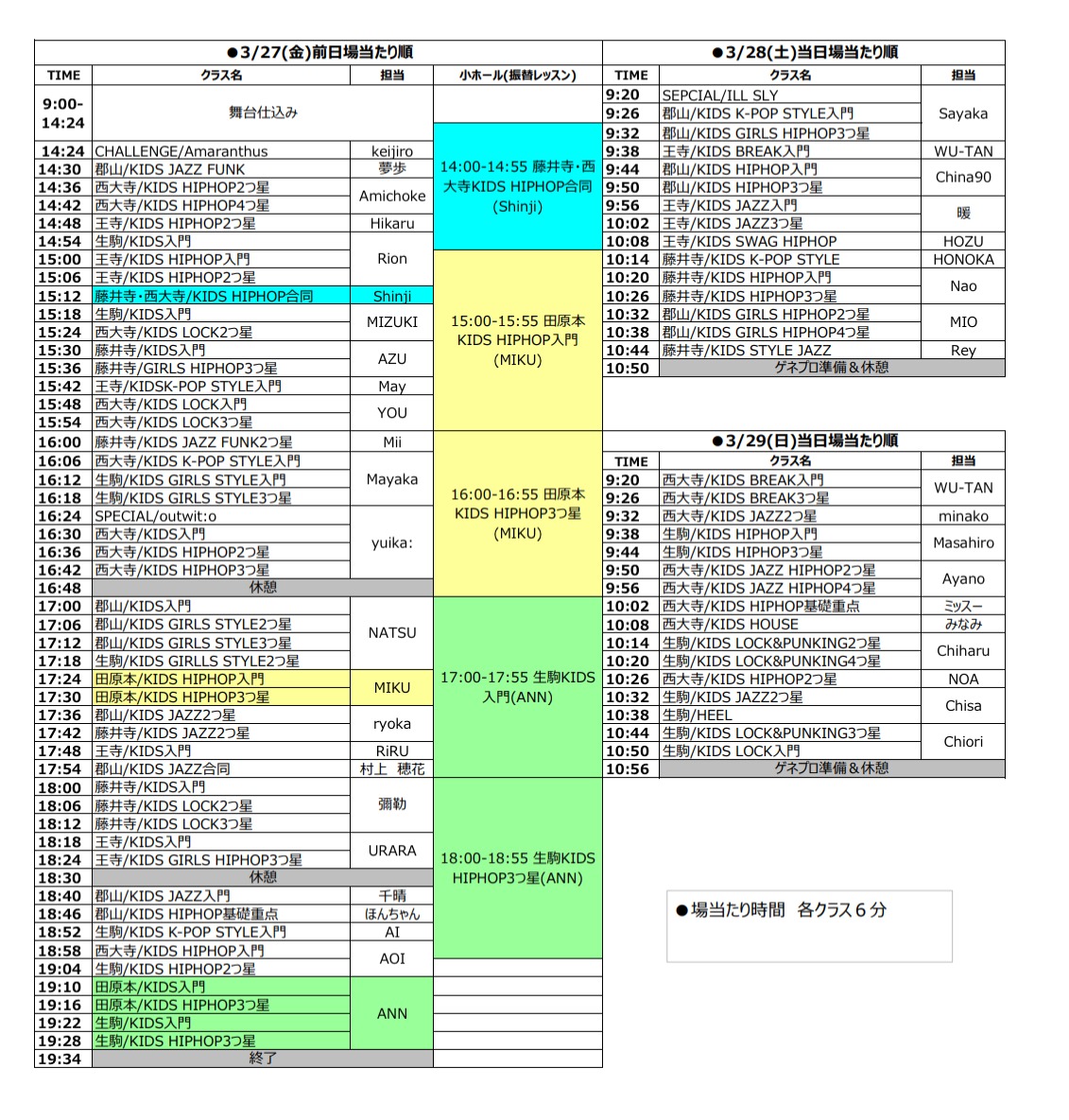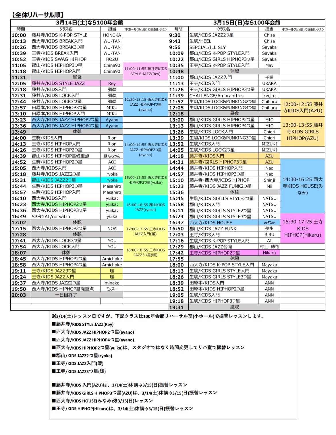 3/14(土)と3/15(日)リハーサル順です。※土曜日クラスの一部は、休講または、会場リハーサル室で振替レッスンします。 |